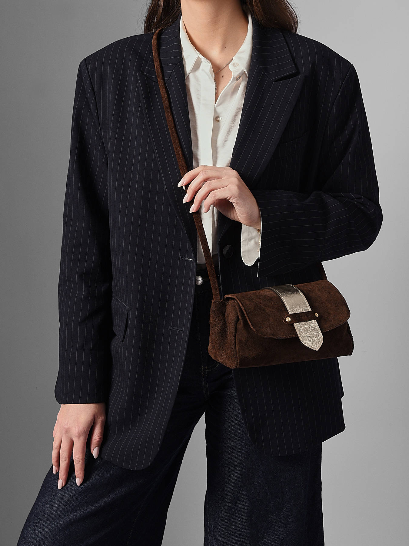 Le sac porté bandoulière AGNES signé ETRIER est conçu en France dans un cuir velours italien, offrant une texture douce et raffinée. Ce modèle est présenté ici en taille S et se ferme par un rabat doté d'un bouton-pression aimanté. Il existe également en taille M pour celles et ceux qui souhaitent une contenance plus généreuse. Le sac est agrémenté d'une languette réversible, composée d'une face dorée et d'une face en cuir assortie au reste du sac. Elle se fixe aisément grâce à deux boutons de col et se glisse dans une poche arrière prévue à cet effet.